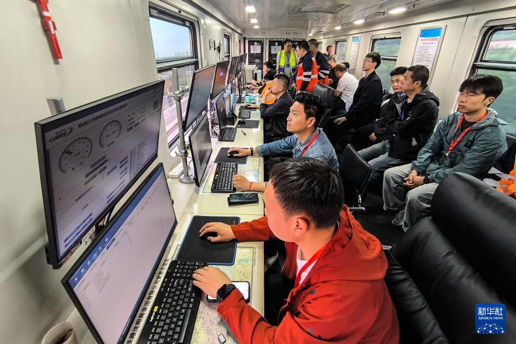 6月1日,铁路工作人员在综合巡检车上监测数据。