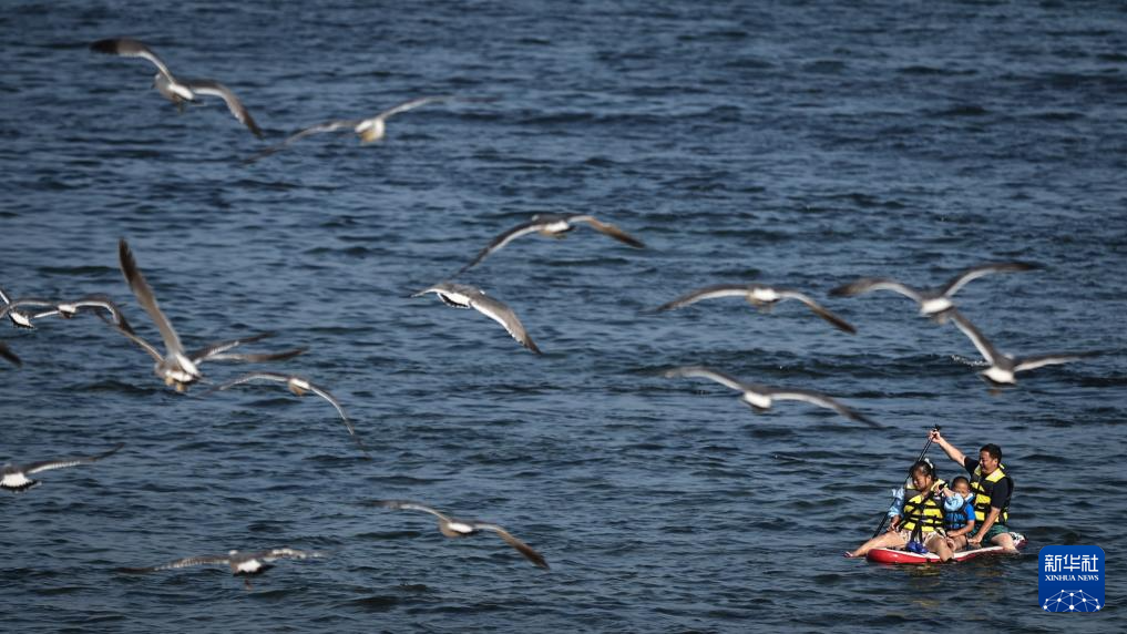 7月10日,游客在大连傅家庄公园海域划桨板。