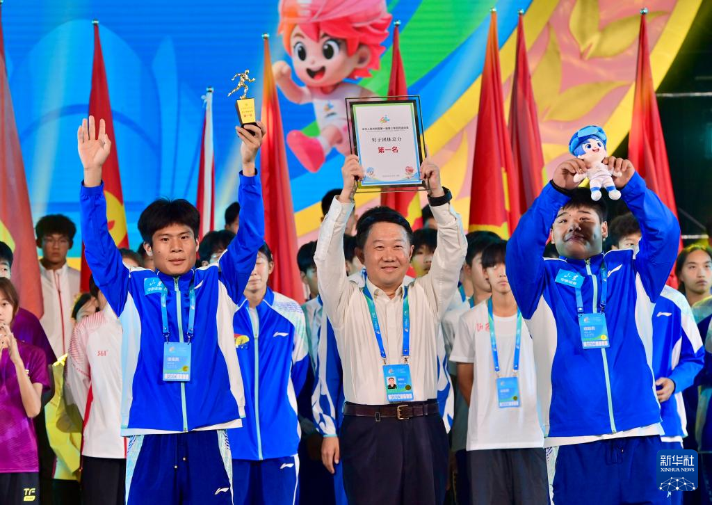 8月15日,获得男子团体项目总分第一名的山东省体育代表团在闭幕式上展示证书。