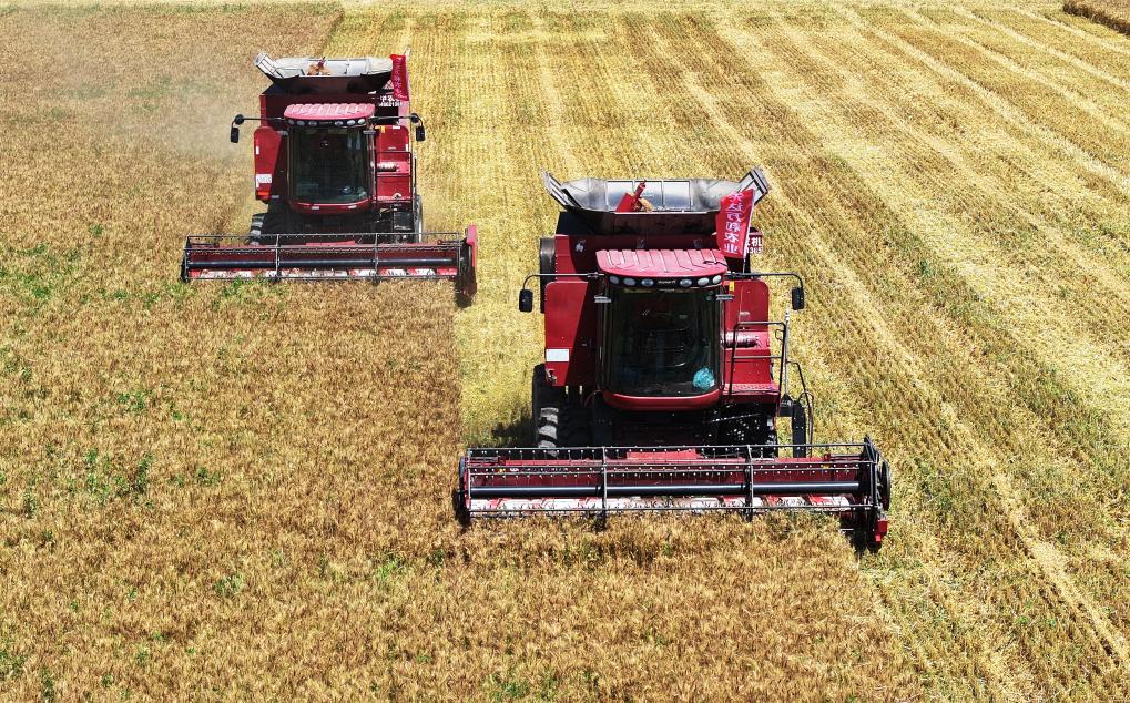 今年7月7日,在辽宁省阜新市彰武县,收割机在收获小麦(无人机照片)。(受访者供图)