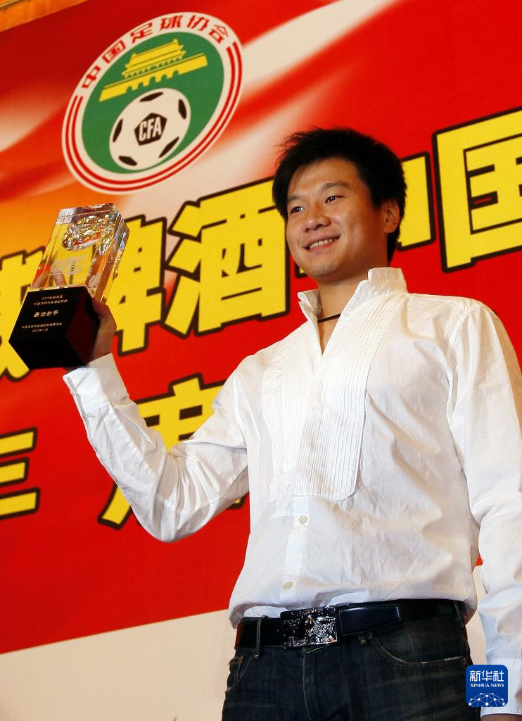 2007年11月17日,山东鲁能队球员李金羽在颁奖典礼上。当日,中国足球协会在上海举行中超联赛颁奖典礼,李金羽荣获2007年中国足球超级联赛“最佳射手”称号。 新华社记者 凡军 摄