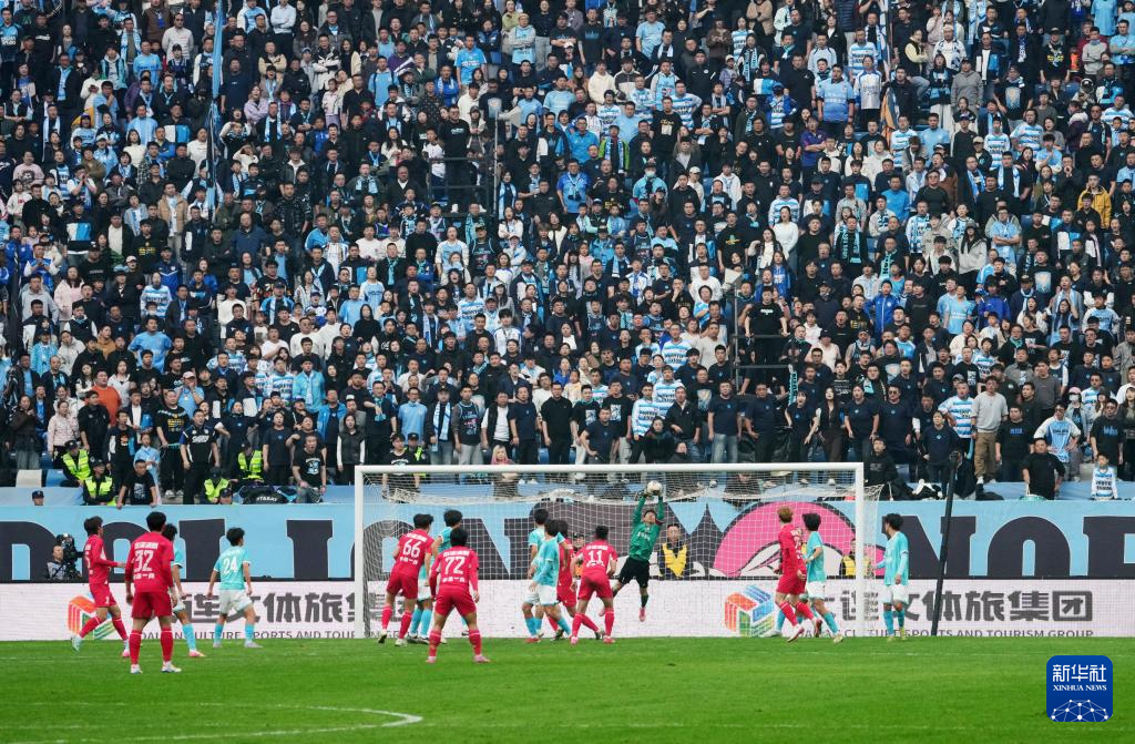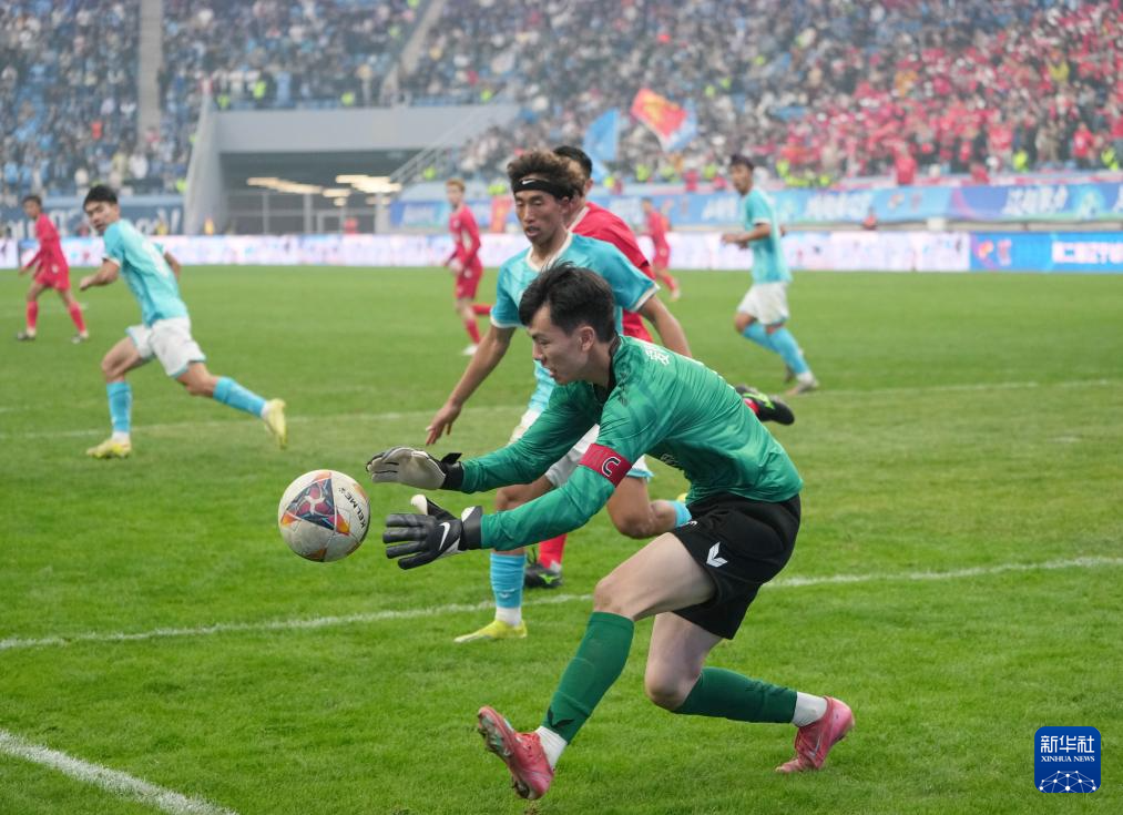 11月15日,大连队守门员萧志仁(右四)门前救险。