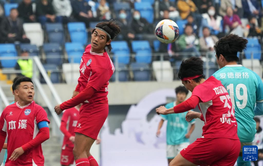 11月15日,大连队球员王跃皓(右一)头球进攻。